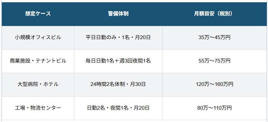 以下は東京・関東エリアにおける一般的な施設警備の費用目安です。あくまで市場相場であり、実際の料金は施設の条件・警備内容・使用する警備員の資格等によって異なります。