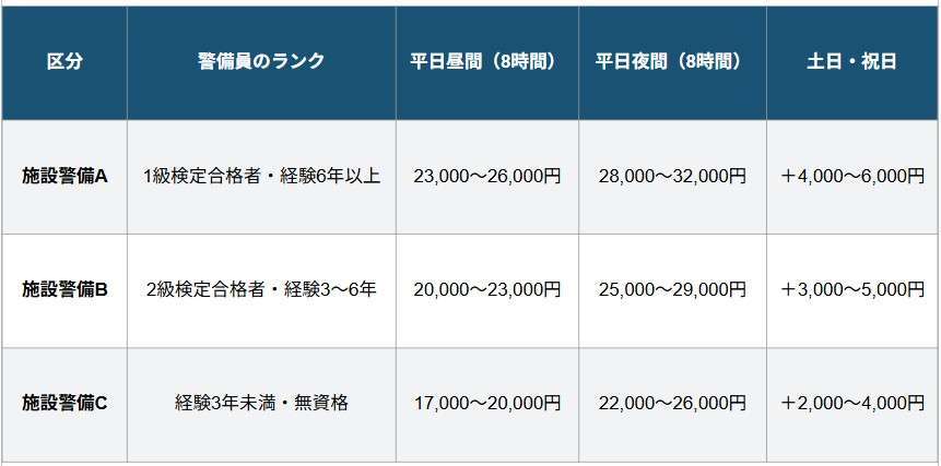 施設警備員は、資格や経験に応じて「A・B・C」の3段階に分類され、国家資格(施設警備業務検定1・2級)の保有者は単価が3,000〜5,000円ほど高くなる傾向にあります。空港や核燃料施設など法令で有資格者の配置が義務付けられている施設では、必然的に料金も高くなります。